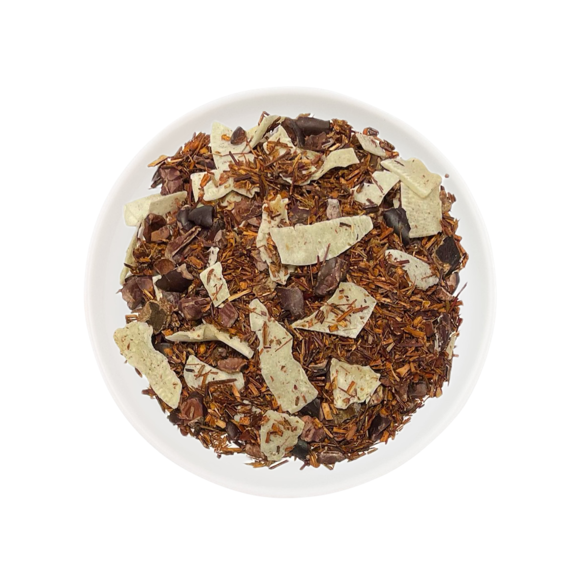 Milder Rotbuschtee mit vielen Kakaokernen und Kokos-Chips machen eine runde Sache aus dieser Teemischung…
